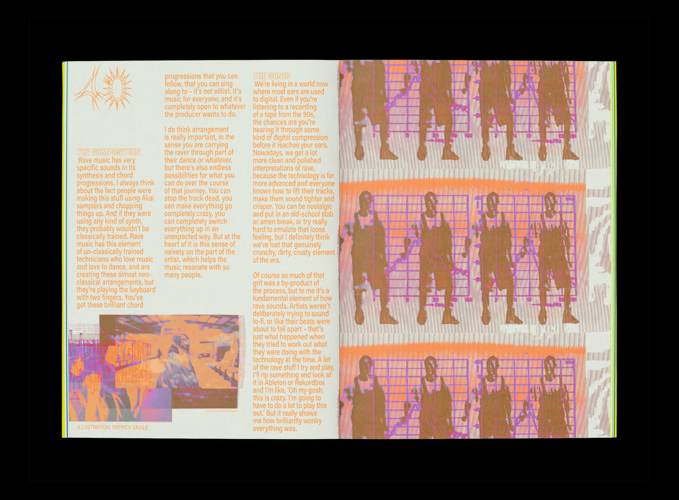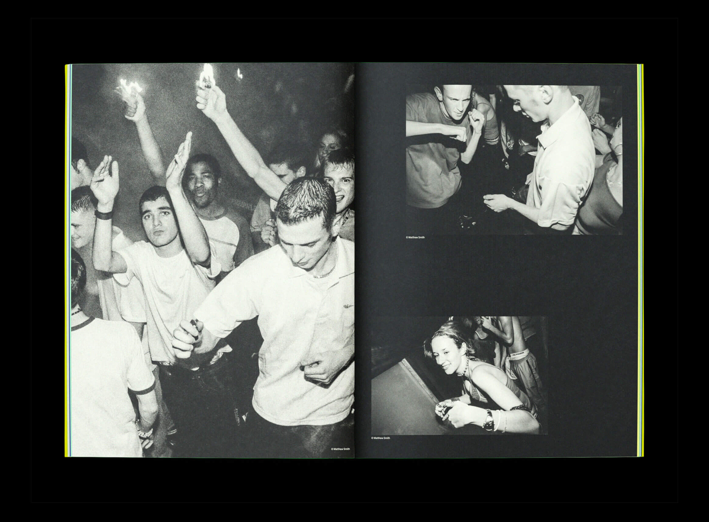 To further evoke the emotive aesthetic of rave culture I commissioned Patrick Saville to produce bespoke illustrations and textural details to accompany curated images from the archives of Mathew Smith and the Museum of Youth Culture.